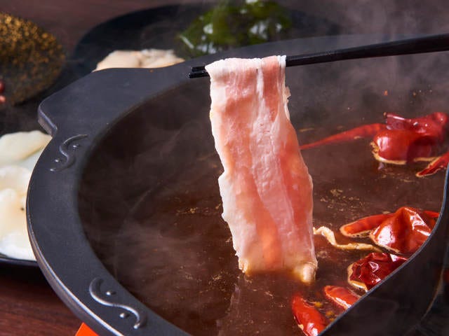 火鍋の具材には、群馬県のブランドポーク「くちどけ加藤ポーク」(写真上)や、築地市場で仕入れる海鮮に国産のみずみずしい野菜などを使用。スープと交互に味わえば、奥深さが一層際立つこと請け合いだ。