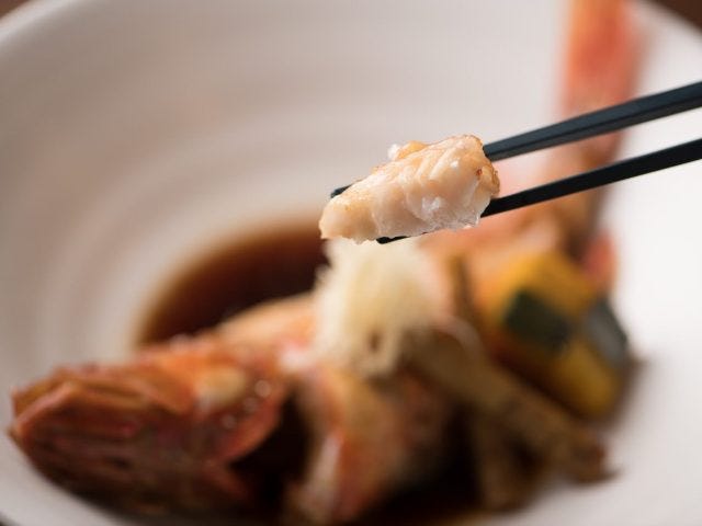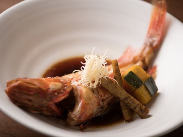味付けは『青山えさき』時代よりほんの気持ち、甘めにしているとのこと。煮付けのイメージが覆るほどの薄味だが、それゆえにキンキの持つ滋味が最大に引き出されている。