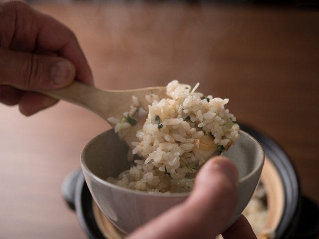 テーブルで炊きあがりを見せた後、厨房で混ぜ込み、美しく盛り付けて供される。混ぜ込むことでミョウガ、カイワレ、大葉、青ネギの香りがさらに引き出される。