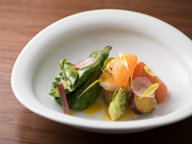 前菜は、「愛知県の平貝と色どり野菜のサラダ仕立て」(写真上)。炙ったタイラ貝、炊いて焦げ目をつけた大根、佐賀高級柑橘類「はまさき」、炊いてから揚げているさつまいも、揚げたつぼみ菜、サラダほうれん草と、多彩な調理法で仕上げている。油を使って調理しているものが多いせいか、クセの強い野菜もコクがあり食べやすい。