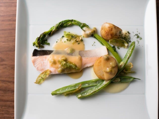 お造りとお吸い物に続いて「青森の桜マスの蒸し物 京都白味噌と蕗の薹(ふきのとう)のソース」(写真上)が登場。絵のような美しさに息をのむ。