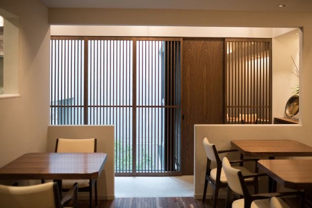フロアは2名掛けのテーブル席が6卓。奥には4名まで入れる個室が1室ある。厨房が見える窓を設けたスタイルに、『青山えさき』をなつかしく思い出す人も多いだろう。厨房の明るめの照明や壁面の間接照明、廊下側の自然光とのカクテル光線が、フロアに繊細な陰影と落ち着き、心地よさをもたらしている。