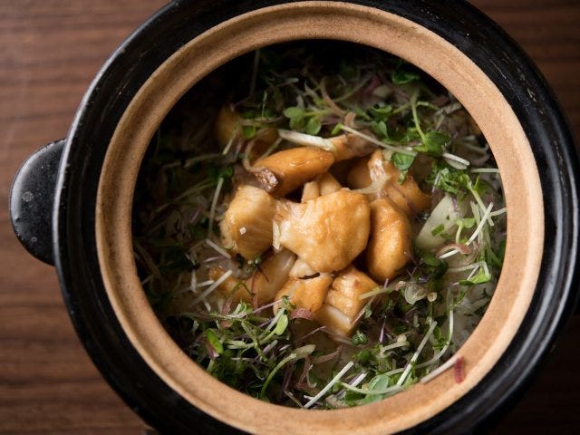 「石川県産無農薬コシヒカリの土鍋炊き込みご飯」(写真上)の具は、日替わり。この日は幽庵地(柚子の香りをつけたたれ)に漬けこんで表面だけを軽く焼いた天然のタイ。薬味というよりもうひとつのメイン具材のように、たっぷりの香味野菜が添えられている。