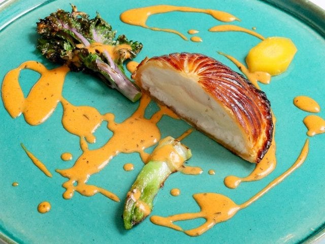 中心にホタテを入れたヒラスズキのムースをパイ生地で包むこの料理、パイはサックサクなのにホタテはレア気味にしっとり。