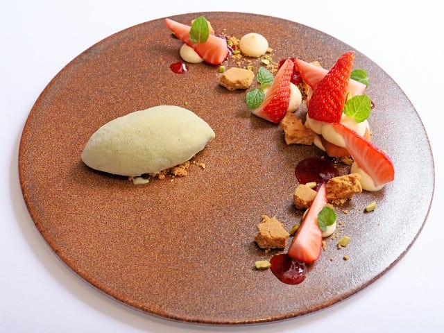 デザートはランチとディナーを合わせて5種類を用意。すべてクラシックなアントルメをベースに再構築している。「タルトフレーズ」(写真上)は名前からタルトの上にイチゴがのっている、いわゆるケーキを予想していたが完全に裏切られた。しかしこれが“良い”のである。むしろイチゴもタルトも生クリームも、食材そのもののおいしさが、より一層味わえる。