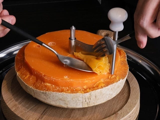 メインの前に提供される口直しはオリジナル料理の「ミモレット」(写真上)。口直しといえば誰しも「グラニテ(シャーベット状の氷菓)」と答えるであろう。しかも提供されるのは通常、デザートの前に位置づけされているチーズである。あまりの斬新さに、考案者でありチーズプロフェッショナル(CPA)の資格を持つ細野さんに訊いてみた。