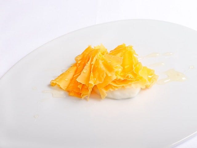 まず、フレッシュチーズの「フロマージュブラン」を敷く。次にフランスはフランドル地方の「18ヶ月熟成のミモレット」をジロール(チーズを削る道具)で薄削りにしてカーネーションの花のように巻いて上にのせる。そして最後に「百花蜜」をかける。キラキラと光る蜜の演出にうっとりする。