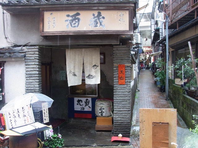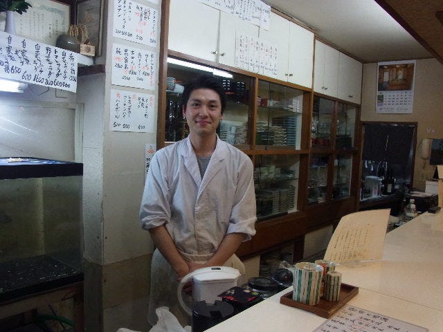 あまりにもレトロで、一瞬入るのをためらうが、看板が傘さしている光景に店主の心意気が見えて、暖簾をくぐる。店内は、磯の香りが染み付いていて、カウンターがやたら広く、うまい魚を楽しむにはもってこい。切り盛りするのは3代目の保坂勇三さん。