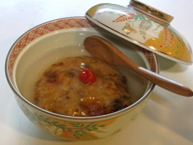 慎也さんの一番のおすすめは「海老れんこん団子」(写真上)だ。お椀のふたをあけると、まず澄んだ銀あんに驚く。中央に鎮座するれんこん団子は、山芋のふわふわ感とれんこんのもちもち感の中に、しめじや海老などいろんな歯ごたえが残り、食感の楽しいことと言ったら……。シェアせず一人で一椀を満喫したい。