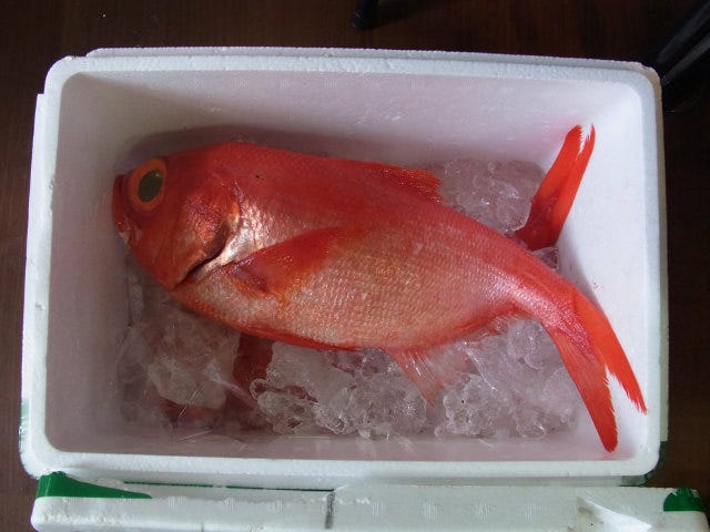 入口近くに鎮座する保冷箱をのぞくと、大きな金目鯛と目が合った。下田港で水揚げされた、2kgほどある肉厚のキンメ。「次回は、キンメを食べてね。このサイズが一番おいしいし、うちで食べるとリーズナブルなんですよ」と、幸子さんが自信たっぷりに話す。再訪を約束。