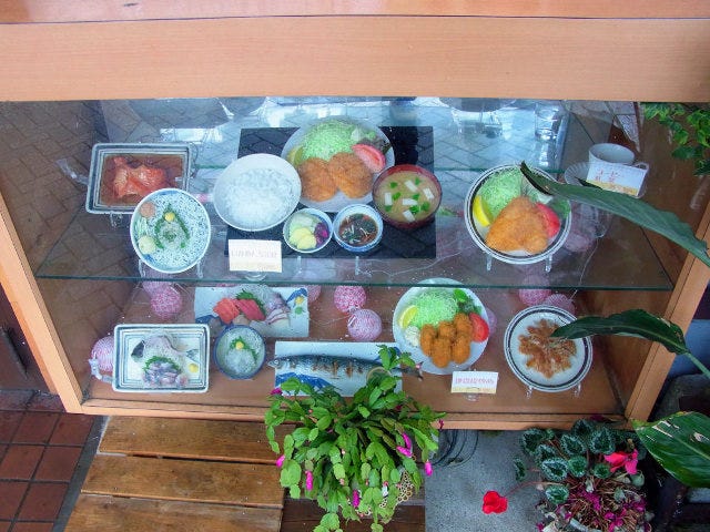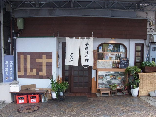 ショーウィンドウのサンプルにそそられる『食事とお酒の店 るな。』。この場所は、現在にぎわっているアーケードができる前、熱海のメイン通りだった。昭和2年の創業は、界隈でも超古株だ。