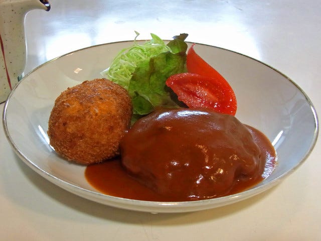 一人でも注文しやすいサイズの「メンチ・カニコロセット」(写真上)は、日本が誇る日本生まれの食文化、正統派の「洋食」。温泉地で日本酒を傾けながら食べる洋食はなんとなくミスマッチに感じる。が、食べ進むうちに、熱海×洋食×日本酒が、妙にしっくりくる不思議……。