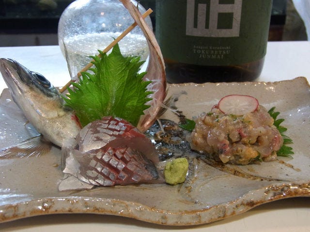 刺身と迷った挙句、「お酒に合うのはなめろうですね」と慎也さんの助言で、なめろうを注文。すると、「今日は大きいアジなので、お刺身も少しつくりますか?」。この気配りに、瞬時に心奪われてしまう。