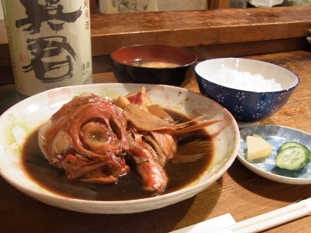 ほどなくして登場したキンメの大きさに、わお! でっかい目玉にドキリ。濃厚そうな煮付けだが、意外にサラリとしていて甘さは控えめで、添えられた豆腐にも味がじんわりしみて、白飯がすすむ。