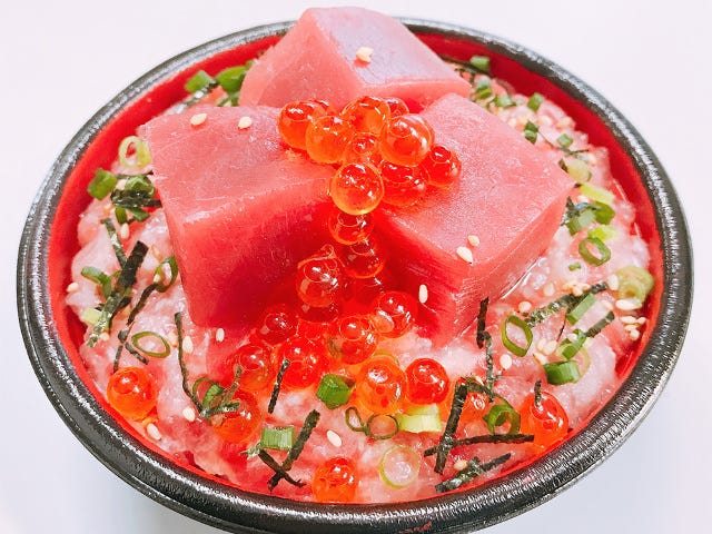 「まんパクin万博2017」で人気グルメランキング総合1位を獲得したのが、こちらのお店『まぐろや黒銀』だ。築地でプロの目利きによって仕入れられる新鮮なマグロの上にはイクラが盛られ、そのビジュアルからして食欲中枢が刺激されるはず。