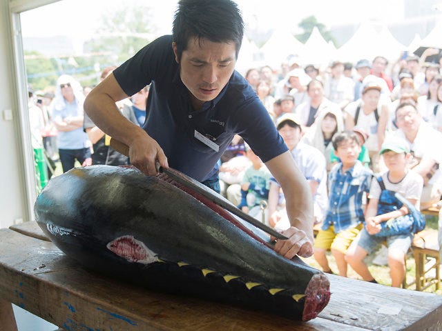 毎年好評を博している巨大な本マグロの解体ショー(写真上)も行われる。『まぐろや黒銀』の協力により、特設ブースでは築地の職人が本マグロを解体し、さばきたての味を提供する。