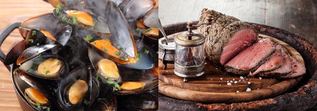 ビールと一緒に楽しめるグルメにも注目。「ムール貝ガーリックバター味」や「ローストビーフ&ポークの盛り合わせ」など、思わずビールが進んでしまうメニューメニューも充実している。