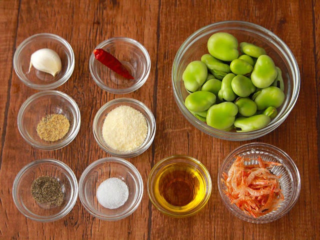 ② フライパンにオリーブオイル、ニンニク、桜エビ、唐辛子を入れて弱火で熱し、ニンニクの香りが立ったら、そら豆を加えて中火でさっと炒め、塩、コショウで味を調える。