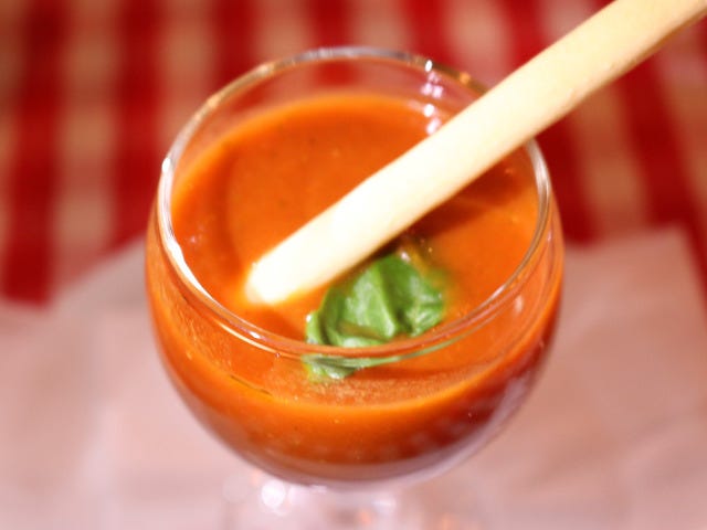 この日のアミューズは、ひと口でいただく「トマトとバジルの冷たいスープ」(写真上)。