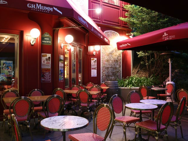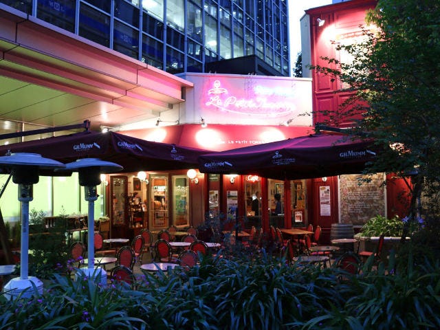 高層ビルがひしめき合う都内有数のビジネス街・虎ノ門の片隅に、新緑溢れる小さなパリがある。木々の影から赤々と煌めくのは『ル・プティ・トノー』の文字。樽上に一杯のワイングラスが描かれたネオンサインが、店名の意を印す。