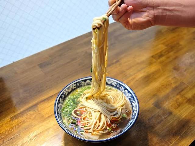 そして日本のラーメンとの決定的な違いは、麺にある。拉麺の“拉”とは“延ばす”を意味しており、蘭州拉麺は、職人が生地をオーダーごとに延ばして仕上げる。
