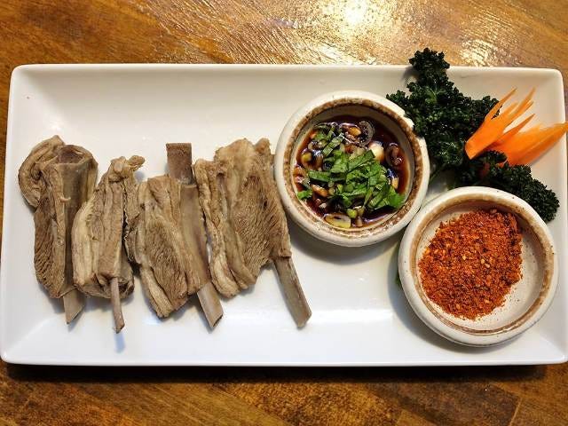 もう一つの人気おつまみメニューが「ラム肉の柔らかスペアリブ」(写真上)。柔らかく煮込んだ羊肉は臭みがなく、添えられているトウガラシ、クミンなどを混ぜたスパイスか、パクチーと葉ニンニクを加えた醤油で食べることを推奨している。