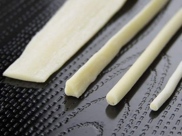 断面が三角に仕上がった「三角麺」(同・右から3番目)。職人の技が光るこの麺は、歯切れのよさが特徴。