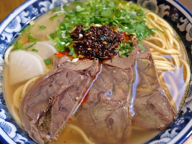 スープには国産の牛ゲンコツ(大腿骨)、牛バラ肉やスネ肉、丸鶏を使い、白濁しないよう弱火で6時間以上炊く。肉の臭みを抑えるために10種類のスパイスを始めに入れ、仕上げに花椒(カショウ)、白胡椒、草果(ソウカ)、茴香(ウイキョウ)など20種類を追加。