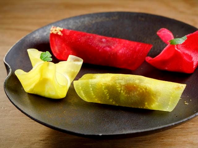 赤と黄の色鮮やかなビーツだが実は茹で方は難しい。特に黄色は茹でると色がなくなってしまうので、火を通したらすぐに氷でしめて色止めをする。原シェフ得意の“魅せる皿”である。
