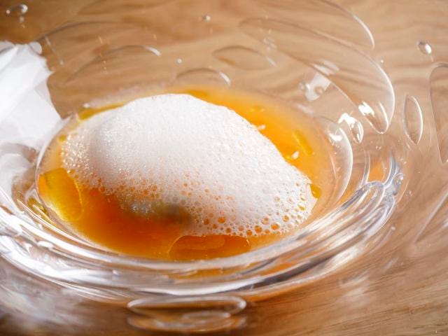 3品目は原シェフのスペシャリテのひとつ「生ハムパンナコッタ仕立てメロンのソース ミルクの泡」(写真上)。生ハムのパンナコッタの上にはその時期においしいメロンをピューレにしたもの、さらにその上に泡状にしたミルクをのせている。生ハムの香りのあとから芳醇なメロンの香りが追いかけてくる。それを少しエッジの効いたフレッシュなオリーブオイルの香りが最後に抜けていく。時間の経過とともに“香り”が変化していく。