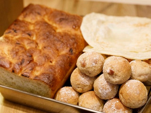 自家製の「キャラメリゼした玉ネギ入り自家製パン“フォカッチャ”」(写真上)を合図に本日の演目の幕があがる。