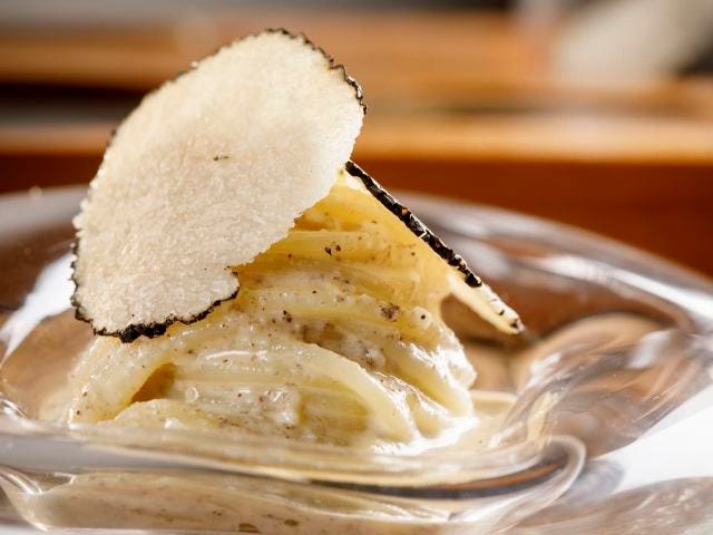 5品目はスペシャリテ「黒トリュフの冷製パスタ ディチェコ フェデリーニ」(写真上)。