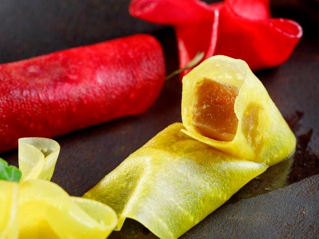 「カンネローニ」は高知産カツオをローストしてカラスミをふりかけ、パスタの包み方の名称「ファゴッティーニ」の中はリコッタチーズ。シャキシャキとした有機ビーツと、やわらかい叉焼を思わせるカツオとの食感のコントラストが楽しい。一方のリコッタチーズは酸味が爽やか。