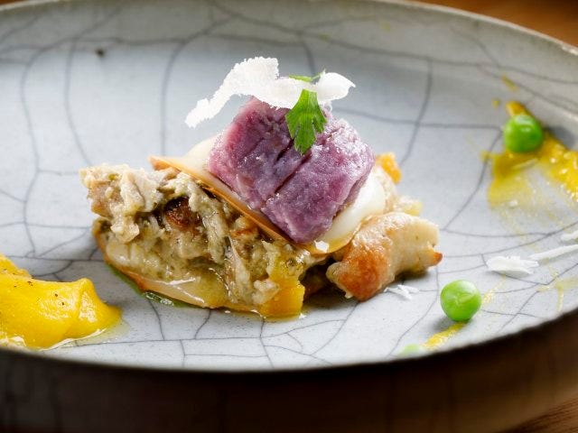 4品目は「スペイン産乳飲み子豚とイタリア産カルチョーフィの煮込み」(写真上)。乳飲み子豚、カルチョーフィ(アーティチョーク)、新タマネギと雪下人参のピューレ、イタリア産グリーンピース、紫芋のニョッキ、スカモルツァ アフミカータ(燻製チーズ)、これだけの個性ある食材をひとつにまとめるだけでなく、ひとつとして欠けては成立しない味に仕上げている。