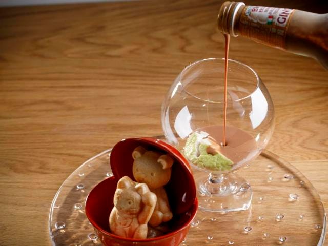 8品目は「デザートの盛り合わせ」(写真上)。ブランデーグラスに何やら緑の物体が入っている。訊くとシチリアのピスタチオを使ったパンナコッタだと言う。そこにシェフ自ら注ぐのは自家製の「チョコチェッロ」。かなりアルコール度数は高めであるが、甘さと一緒にすることでアルコールを和らげた「アッフォガート」をイメージしたひと品。手前のお椀の中には豪徳寺のシンボル「招き猫」とお友達の「クマ」のイチゴムースの最中。しっかりと鎮座させるため下にはマルサラ酒の効いた栗のペーストを。シェフの遊び心たっぷりのデザートである。