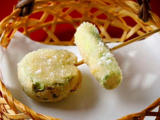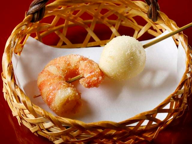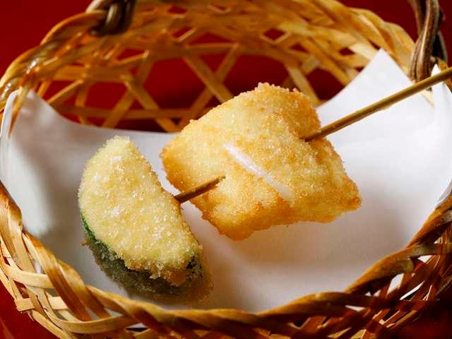 2本目は「ズッキーニとイカ」(写真上)。アスパラガス同様、ズッキーニもうまみのジュースがあふれてくる。イカは甘く歯切れも良い。串揚げをコースに入れたのはなぜなのか問うと、「だって食べたいでしょ?」と笑う。