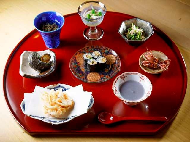「白魚の白煮とうすい豆」「豆苗とササミの胡麻和え」「炙りホタルイカ」「紫カリフラワーのすり流し」「白えびのかき揚げ」「このわたの小巻寿司」「姫さざえのうま煮」「じゅん菜の土佐酢」の8種である。その日により内容は変わるが、どれも素材に寄り添う味わいだ。