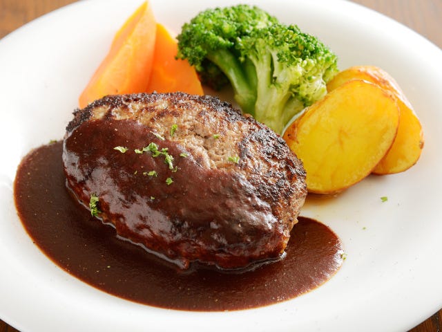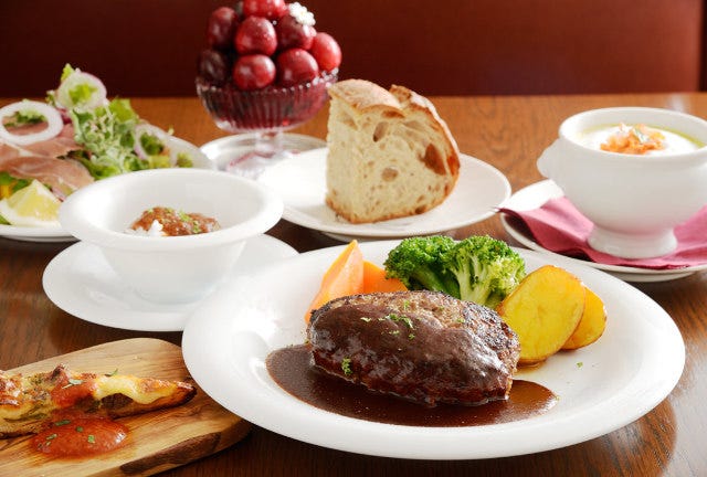 メインは鶏もも肉のソテーや和牛ビーフシチュー(+500円)など6種からチョイスできる。写真上は「牛肉ハンバーグ」。牛肉100%ならではの肉感が醍醐味で、ナイフを入れた瞬間に、お肉のぎっしり感が伝わってくるほど。噛むほどに肉の甘みとうまみを感じるハンバーグだ。