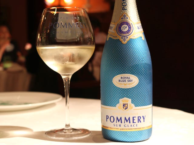 繊細に残るブドウの余韻で、ピレネー産のゴルゴンゾーラチーズを味わっていると、氷の入ったワイングラスとともに、ざわめきのなか“本日のサプライズシャンパン”が登場。