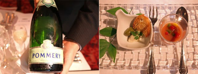 「今宵は100周年というメモリアルイヤーに合わせて『シャンパーニュ ポメリー』のシャンパンによるペアリングを用意しております」とデルマスさん。1836年に創立され、1874年に世界で初めて辛口シャンパーニュを作ったメゾン『シャンパーニュ ポメリー』との贅沢なマリアージュを前に、さらなる歓喜が湧くなか、美食の宴が幕を開ける。