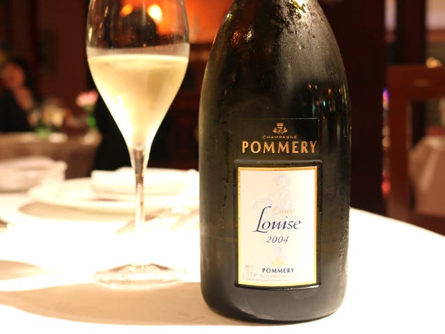 薫香と肉のうまみが交わる瞬間、良い年の良いブドウだけで作られたというポメリー史上最上級のシャンパーニュ「ポメリー キュヴェ・ルイーズ 2004」(写真上)を口に含むと、ミネラル香や柑橘味が加わって複雑味を煽ってくる。