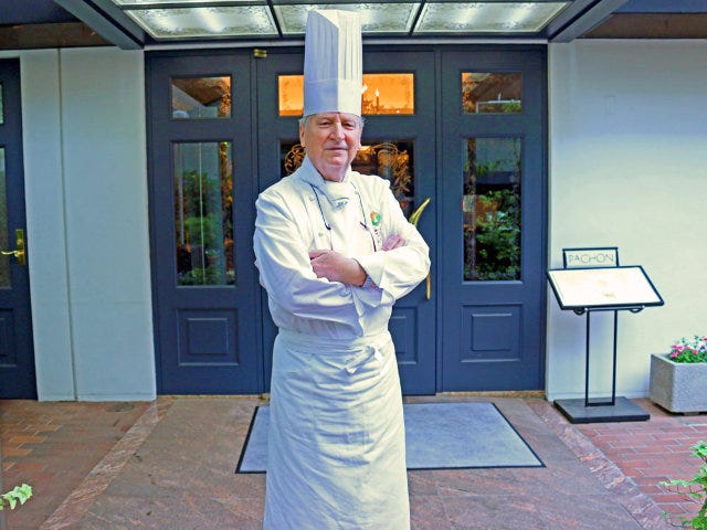 「この街で『パッション』を営みはじめて、34年が経ちました。店のシンボルである大きな暖炉は、ポール・ボキューズ氏から受け継いだもの。メインディッシュの肉料理は、オープン当初から毎晩、この暖炉で焼いて提供しています」と話すのは、同店でオーナーシェフを務めるアンドレ・パッション氏(写真下)。