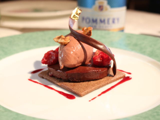 「最後は、新作となる『ポメリー ブルースカイ』を用意しました。蜜のような味わいに合わせて、甘いハーモニーをお楽しみください」というアナウンスに合わせて、「ヴァローナチョコレートと木苺 サブレとアイスクリームで」(写真上)が供される。ツンと冷えたシャンパンの果実味が、異なる食感と温度で3層に重なり合うカカオを刺激し、テクスチャーを翻弄する。