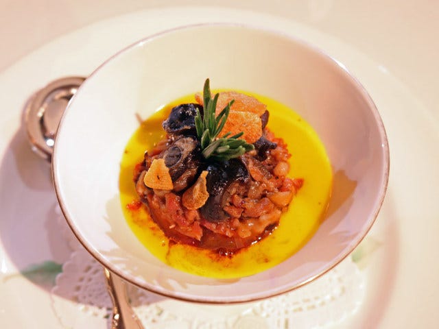 豚の挽き肉や豚足で一度ソーセージを作り、完成したらミンチ状に細かく刻んでエスカルゴと一緒に煮込む。気の遠くなるような作業の末、完成した味は、口中をオリエンタルな香りで包み込み、南仏の情景を想像させる。