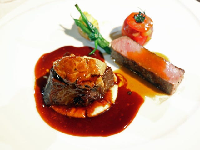 歓談も弾む頃、メインディッシュの「和牛サーロインの暖炉焼き」と、マデラ酒で2日間マリネしたホホ肉を煮込み、フォワグラのポワレをのせた「和牛ホホ肉のマデラワイン煮」(写真上)が運ばれてくると、店中が芳ばしい香りに包まれる。