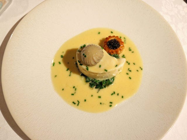 魚料理は「平目と帆立貝のスフレ シャンパーニュソース キャビア添え」(写真上)。「ポメリーとのペアリングに合わせて、ソースも同じ銘柄で仕上げました」とパッション氏。つるんとなめらかな魚介のスフレは、弾力が強くモチモチとクセになる食感。シャンパーニュのほのかな酸味が、魚介の濃厚なうまみに絡んで、あと味をさっぱり仕立ててくれる。