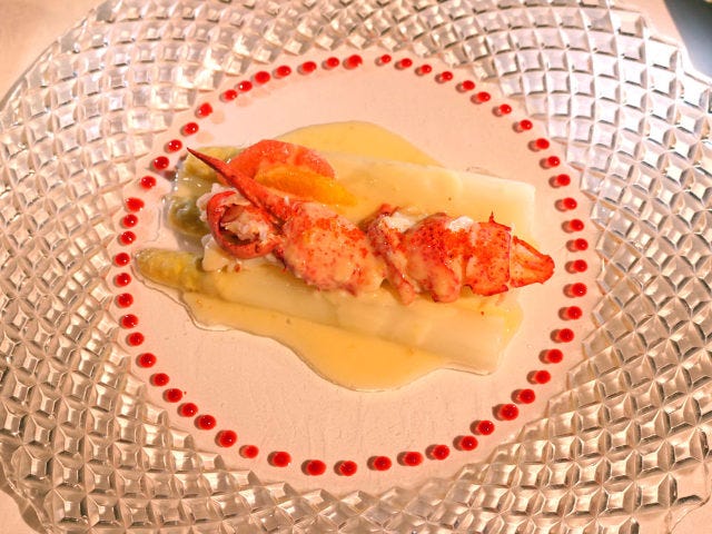 セレブレーションディナーにぴったりな、紅白のコントラストが見目麗しい「オマール海老のメダヨン 仏産ホワイトアスパラガスと柑橘類 ゆずバターソース」(写真上)。