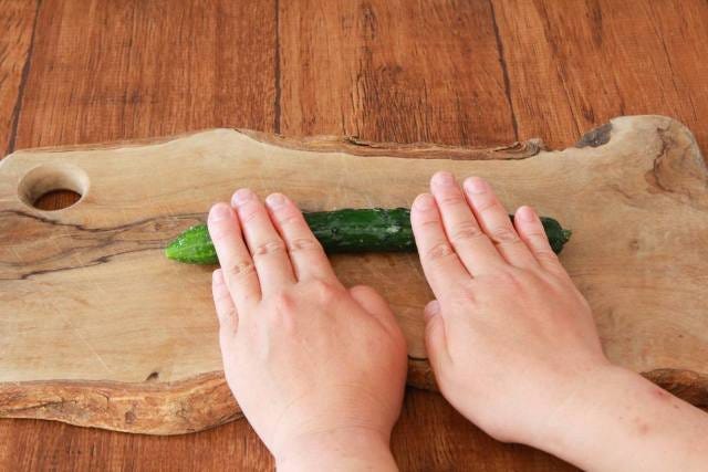 キュウリをすりおろしたら、青臭さが気になるのでは?と思う人もいるかもしれないが、すりおろす前に「板ずり」をすれば大丈夫! キュウリに塩をまぶしてすり込み、まな板の上でゴロゴロ転がせばOKだ。