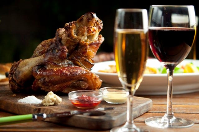 もう一つの肉料理は「骨付豚すね肉のロースト」。豚の後ろ足を3時間以上かけて煮込み、オーブンで焼きあげるという手間ひまをかけ、外側はカリカリ、中はジューシーに仕上げた逸品だ。
