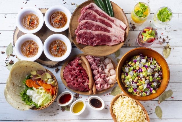 クロスフィットトレーナーAYA 先生監修メニュー「食べるサラダ」+BBQ 盛り合わせ(函館産大沼牛サーロインステーキ含む)+野菜盛り合わせ+〆のミニキムチ冷麺